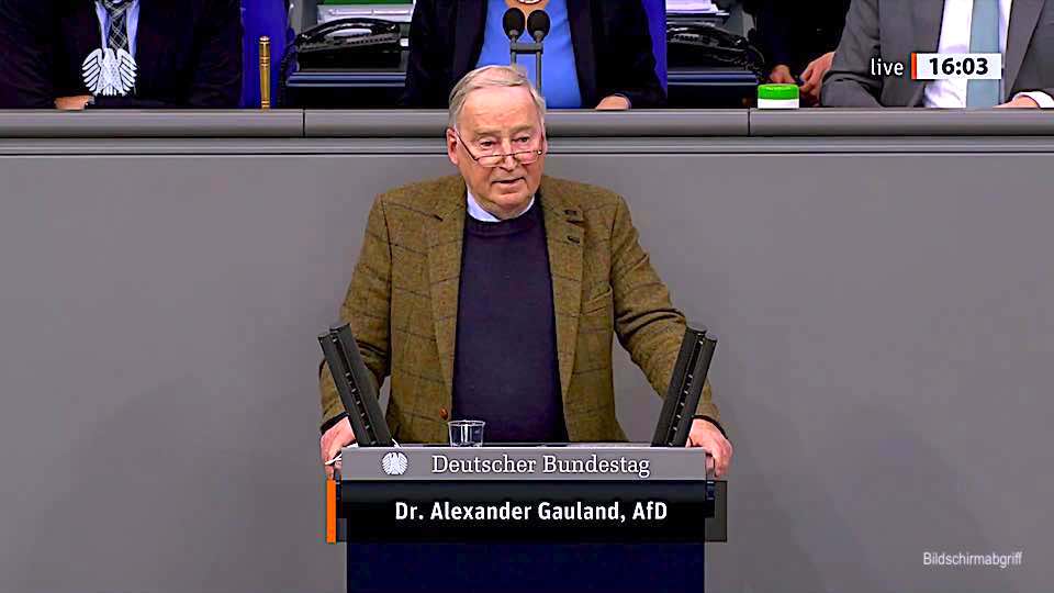 Dr. Alexander Gauland – Rede vom 10.02.2021 10Feb 202127 Okt 2021Add a comment Dr. Alexander Gauland – Aktuelle Stunde zu den jüngsten Entwicklungen in Russland https://www.youtube.com/watch?v=LTTyftlkGho?rel=0 Es ist falsch, auf eine für uns wie für Russland nützliche Erdgasleitung zu verzichten, nur weil uns die Wertebasis, auf der Russland regiert wird nicht passt! Teilen auf: Klick, um auf Facebook zu teilen (Wird in neuem Fenster geöffnet) Facebook Klicke, um auf X zu teilen (Wird in neuem Fenster geöffnet) X Klicken, um auf Telegram zu teilen (Wird in neuem Fenster geöffnet) Telegram Klicken, um auf WhatsApp zu teilen (Wird in neuem Fenster geöffnet) WhatsApp Klick, um auf Pinterest zu teilen (Wird in neuem Fenster geöffnet) Pinterest Klick, um auf LinkedIn zu teilen (Wird in neuem Fenster geöffnet) LinkedIn Klick, um auf Reddit zu teilen (Wird in neuem Fenster geöffnet) Reddit Klick, um auf Tumblr zu teilen (Wird in neuem Fenster geöffnet) Tumblr Klick, um auf Pocket zu teilen (Wird in neuem Fenster geöffnet) Pocket Mehr Klicken, um einem Freund einen Link per E-Mail zu senden (Wird in neuem Fenster geöffnet) E-Mail Gefällt mir Wird geladen … Ähnliche Beiträge