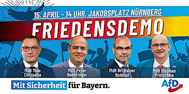 Am 15. April um 14:00 Uhr findet in Nürnberg die Friedensdemo der AfD Bayern auf dem Jakobsplatz statt.